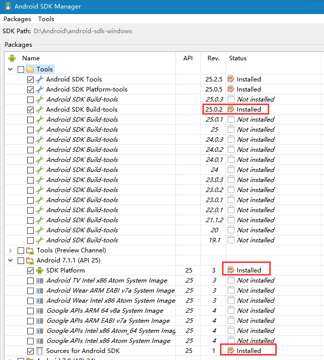需要Android SDK Build-tools 25.0.2 和Extras下的Android Support Repository